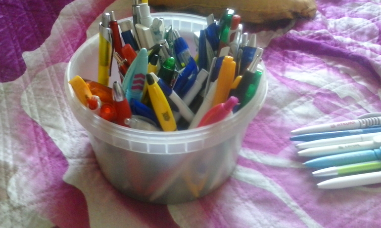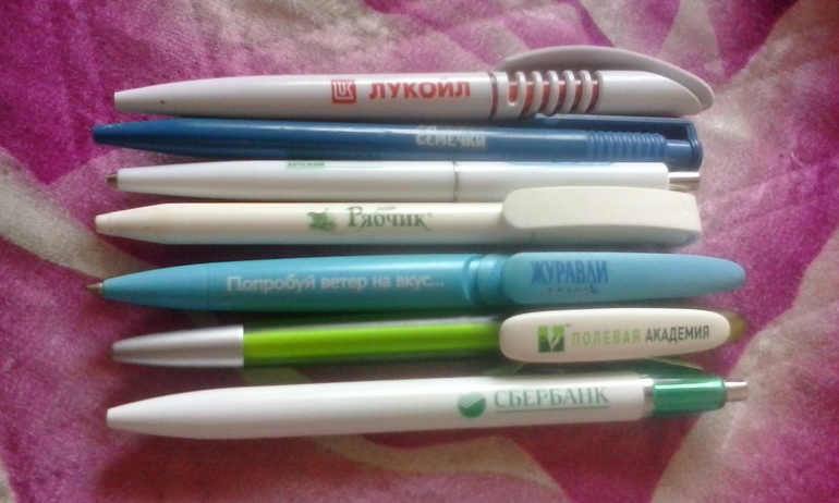 4) Игра с ручками (карандашами, фломастерами и т.д.). Мой муж копит (такая уж вот у него особенность) обыкновенные шариковые ручки. Ну, не совсем особенные, а ручки каких-то фирм или с интересными логотипами или надписями.