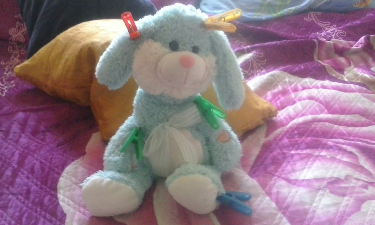 3) Игра с прищепками. Можно прицепить разноцветные прищепки к мягкой игрушке или к кусочку ткани (если кому-то жалко зайчика, белочку ))))) Мы всегда играем в "спаси зайку". Дочка с удовольствием спасает зайку от прищепок. Можно также прищепить их к футболке самого ребенка (тоже практикуем и с интересом отцепляем их - это сложнее, чем с игрушки).