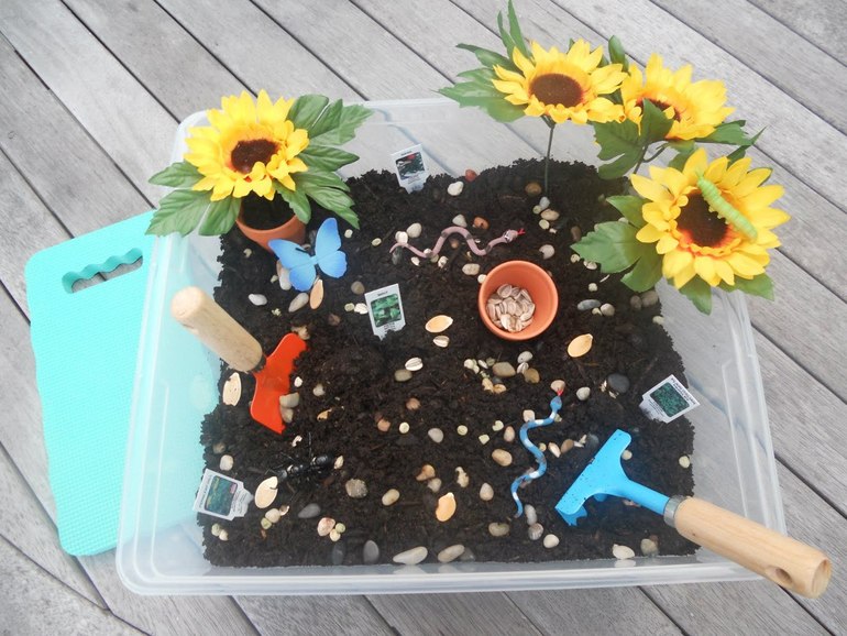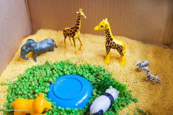 Орудия: маленькие совки, грабли и лопатки, чашки, воронки, сита, пинцеты. Вероятнее всего, первое знакомство малыша сведется к пересыпанию и перекладыванию материалов. Но уже для годовалых малышей можно вводить в оборот небольшие фигурки героев. Малышам нравится закапывать и находить маленькие игрушки. Можно спрятать в сыпучем материале 10-12 игрушек и предложить ребенку найти их.