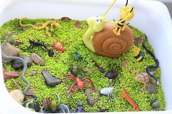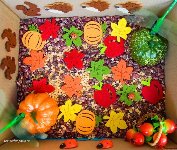 От 3 лет и старше (ребенок готов играть в сюжетные игры и помогать в оформлении коробки)Для старшего возраста сенсорные коробки становятся не только инструментом для развития всех органов чувств, но и пространством для фантазий, логических и познавательных игр. Если в качестве наполнителя использовать несколько видов бобовых, одним из заданий станет сортировка и раскладывание фасолин и чечевиц по отдельным мисочкам при помощи пинцета. Героем такой игры может быть белка, птичка или даже Золушка.