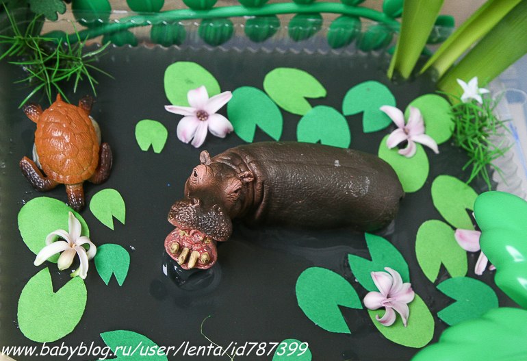 После первого знакомства с материалом, можно предлагать ребенку задания: пересыпать из одной чашки в другую, подобрать соразмерное орудие для вычерпывания воды из бассейна, распределить сухопутных и живущих в воде персонажей в соответствующую среду и т.п.