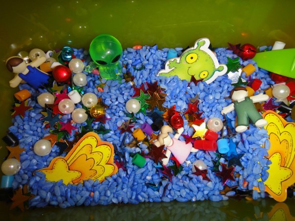 Основой для сенсорной мини-площадки могут стать макароны разных размеров и форм (огромные трубочки, маленькие рожки и спирали, бантики, звёздочки, буквы и фигурки); разноцветные фасоль и чечевица; рис, тонированный пищевыми красителями; пшено или овёс.