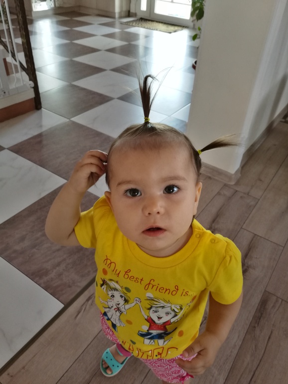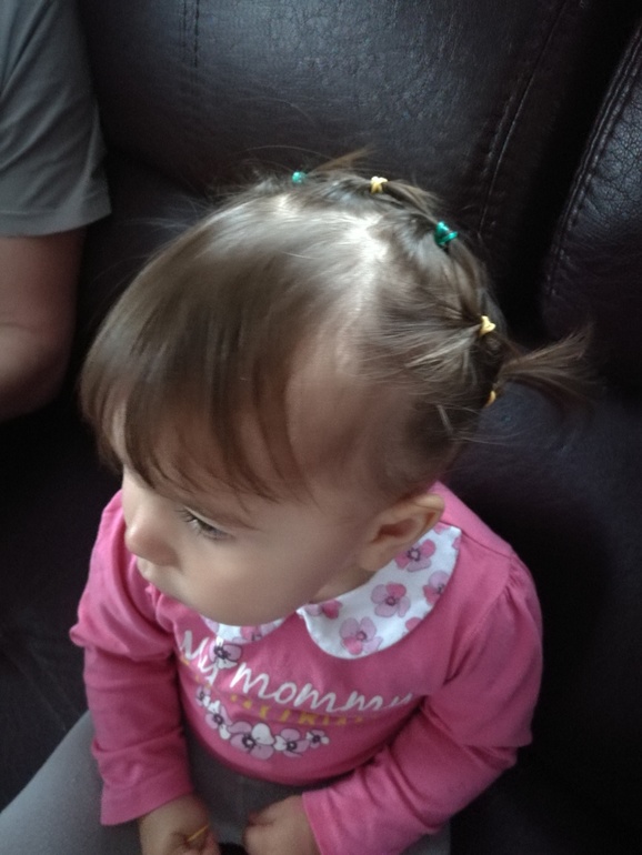 Такая милая, невозможно просто! ) а у меня Даша не даёт так причёски делать , хотя она и постарше на 2 месяца )) ну вот ни в какую! )