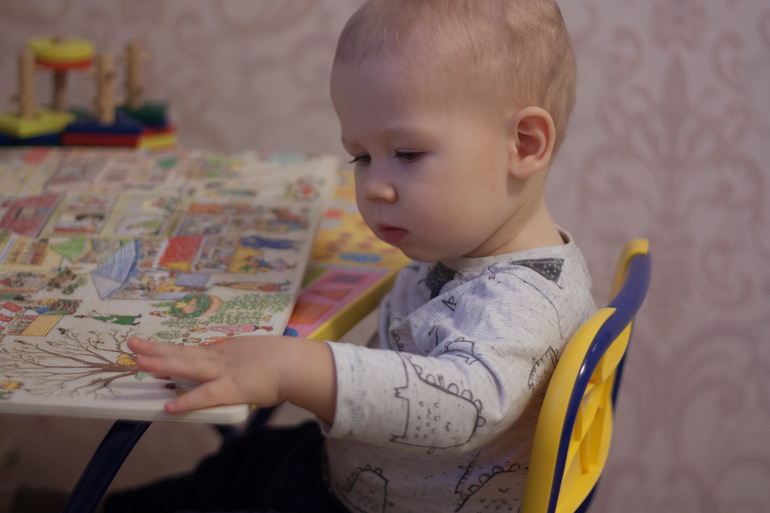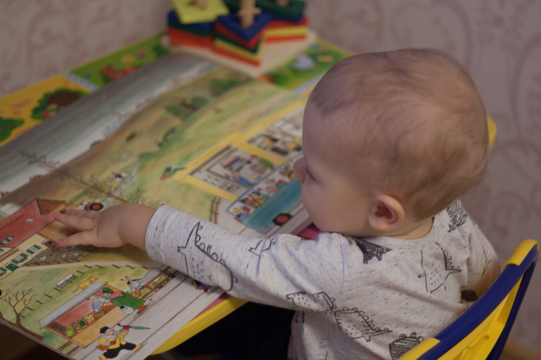 1. Выбор места и формы подачи зависит от характера. Если ребенок тихий, "мамошный", ценит тесный физический контакт - можно рассматривать книгу сидя у взрослого на коленях. Для "шилопопа" можно разложить книгу на коврике (благо она из очень твердого картона и смять ее невозможно). Для самостоятельного малыша подойдут занятия за собственным столом (это наш вариант, хотя предыдущие два тоже используем).