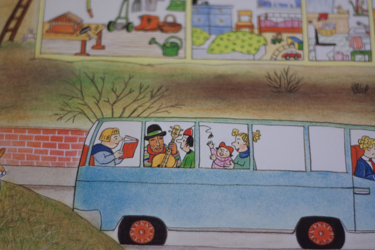 - найти одного персонажа, который заинтересовал ребенка и искать его на следующих страницах (у нас это "дядя с гитарой");