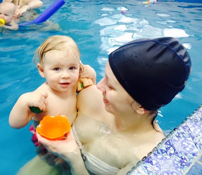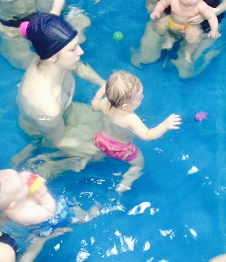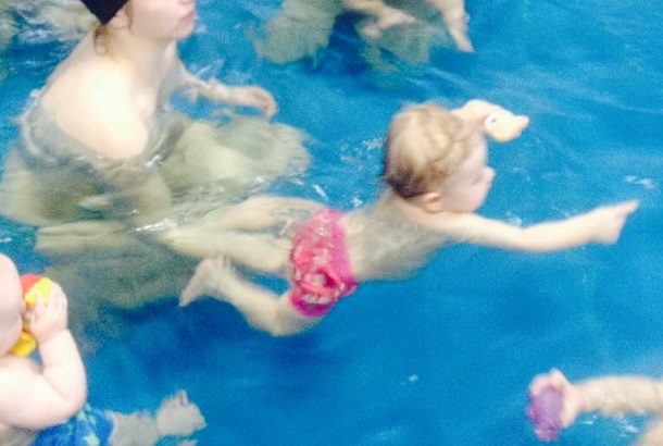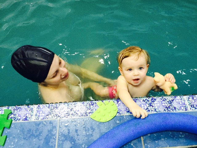 На наших тренировках в бассейне это тоже отразилось. Прижимается, руками и ногами обнимает и не оторвать ее, чтобы упражнения делать, только игрушки помогают, так и плаваем, обе руки заняты