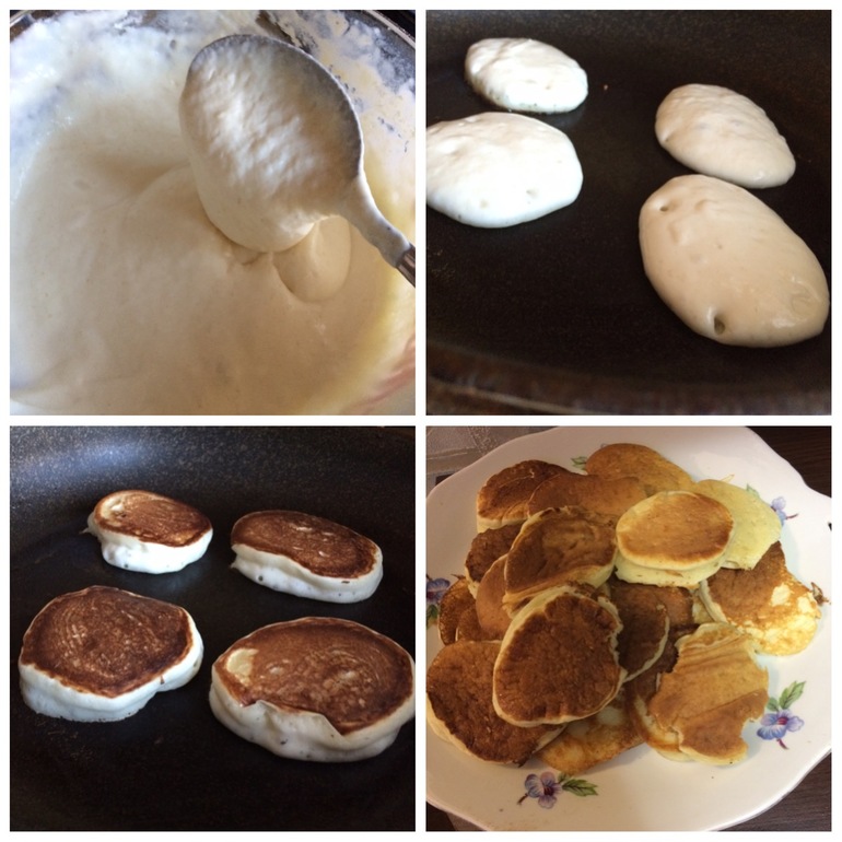 Кисломолочку подогреваю чуть в микроволновке до комнатной температуры. Добавляю творог и сахар, мешаю. Потом муку и соду. Даю постоять 30 минут и на горячую сковородку без масла.