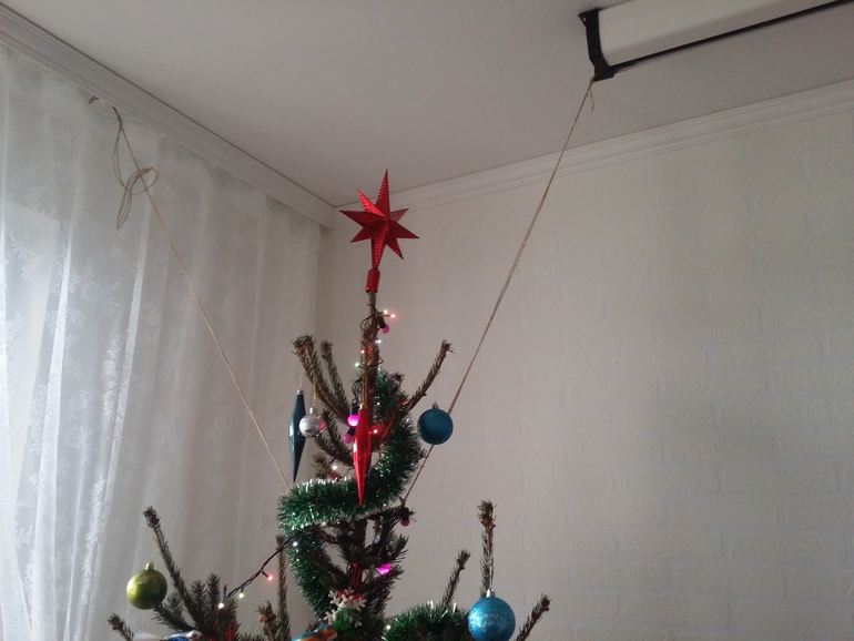 Даже елка привязана к потолку к специально вбитым дюбелям: