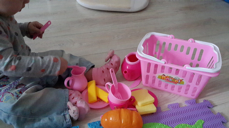 Нам сегодня бабушка привезла печку, две кастрюльки, сковородки, тарелочки, ложки вилки и ножи. Нравится! Пол дня варила печеньки в кастрюльке и кормила бабушку. Даже спать легла у бабушки на руках, сама подошла, обняла и заснула))) теперь нужно купить "продукты"