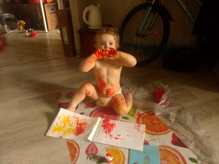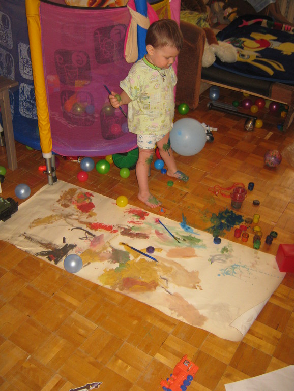 Это еще у меня клеенки не было))) Просто пол затирала. Ну и следила, чтобы больше не на чем не рисовал, кроме бумаги, стены одной, пола и себя.