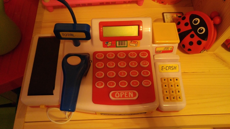 Играем в магазин но не много купила тележку и продукты но че то тележка стоит без дела а касса иногда пользуется спросом деньги любит:) и катает на кассовой ленте игрушки