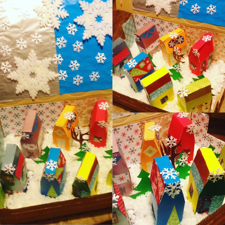 2. Наш Адвент- календарь. Как только вернулись мы с отдыха стартанул наш первый в жизни адвент календарь. Я делала его на скорую руку, так как с погодками время ограниченно, плюс на работе был завал перед отпуском. Тема была снежный городок. Сделала все в коробке, чтоб можно было утром доставать и сразу прятать, а то велико желание все домики сразу раскурочить. В домиках наши любимые хот Вилсы и маленькие зверюшки.