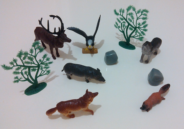 Еще у нас есть недорогой набор фирмы "Диалоги о животных" с лесными животными России (волк, лиса, кабан, орел, олень и белка). Этот набор тоже шел с аксессуарами, я с ними специально и выбирала (2 дерева и камушки).