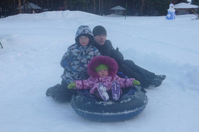 Ездили кататься на плюшках, думаю ну там то доча испугается(хотя они не крутые горки) покатаю ее на детской, но не тут то было. доча напрасилась прокатиться с папой и братом.Когда поднялись на верх доча выдала мне :"пикольна"(прикольно). Больше она от них не отставала и катались вместе.