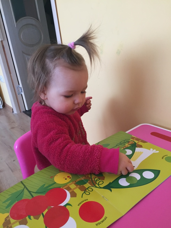 Читаем,а точнее рассматриваем книжки,я спрашиваю ее что где и она показывает пальчиком))Недавно открыли для себя книжки с наклейками)очень увлекло