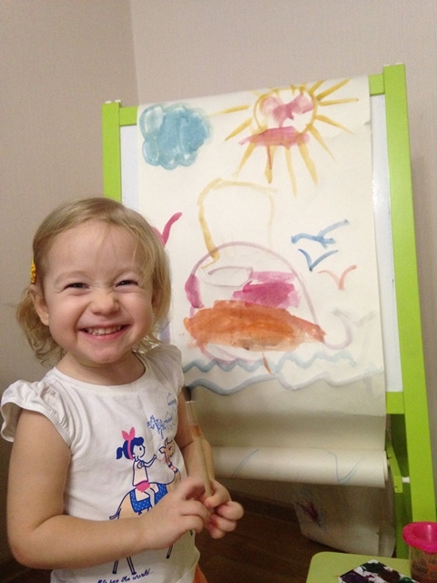 Художник со своим шедевром (мое только облако, 3 чайки, 1 волна, хвост кита и само солнце без лица. Все остальное - дело рук Мии).