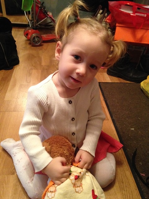 Мия любит готовить из чего-нибудь реального - воды, пены, крупы или декоративных камней. Ну то есть любит пересыпать/переливать все. Очень часто помогает мне печь - если надо замесить тесто или тем более насыпать муки и сахара, она уж точно не пройдет мимо=) Полюбила одевать своих зверей и пеленать их. Пытается плести косы. Любит «делать прически». Освоила многие застежки - кнопки, пуговицы, молнии, крючки (я это заметила, конечно же, благодаря самодельным книгам, так бы и не заметила).