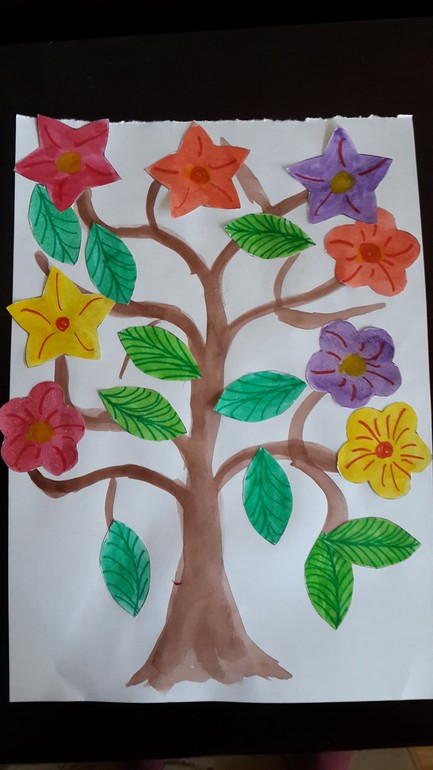 1. Понадобится: большой ватман + листочки (нарисованные или распечатанные) + двусторонний скотч или клей. Рисуете на ватмане дерево (только ствол и ветви). Рисуете/распечатываете листочки и цветочки. Даете ребенку приклеить их на дерево.