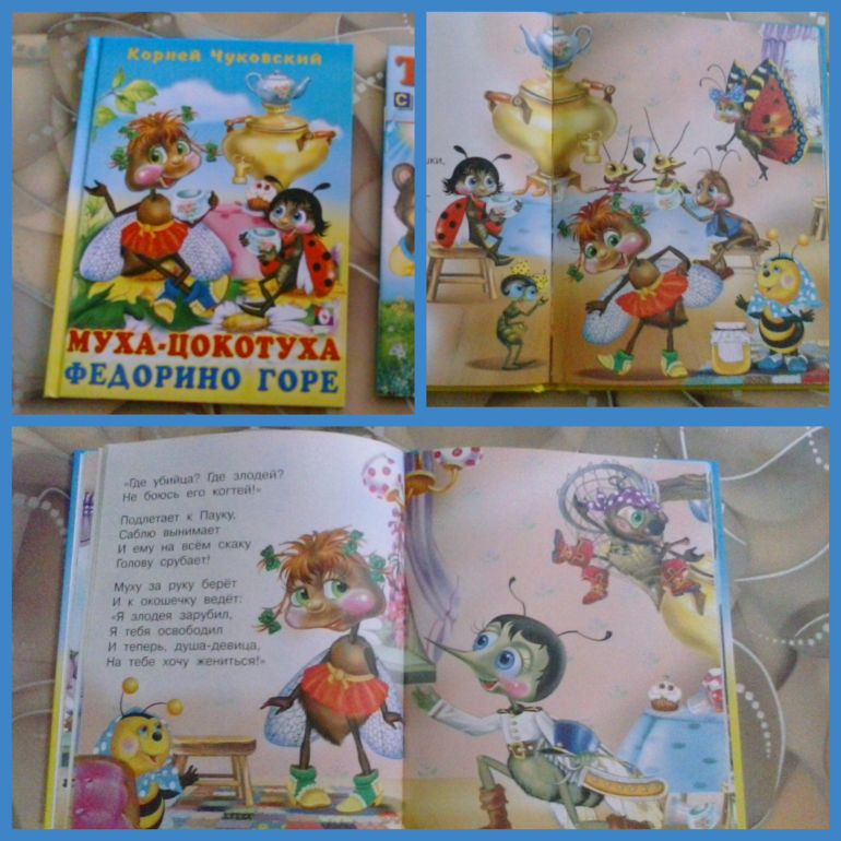 4. "Муха - Цокотуха". Давно хотела купить, но все казалось, что не доросли. Понравилась книга яркими иллюстрациями, не пугающими ребенка. Дочке очень понравилась сказка про муху. Тем более, что в этом году мы уже познакомились с живыми мухами, комарами, паучками и пчелками.