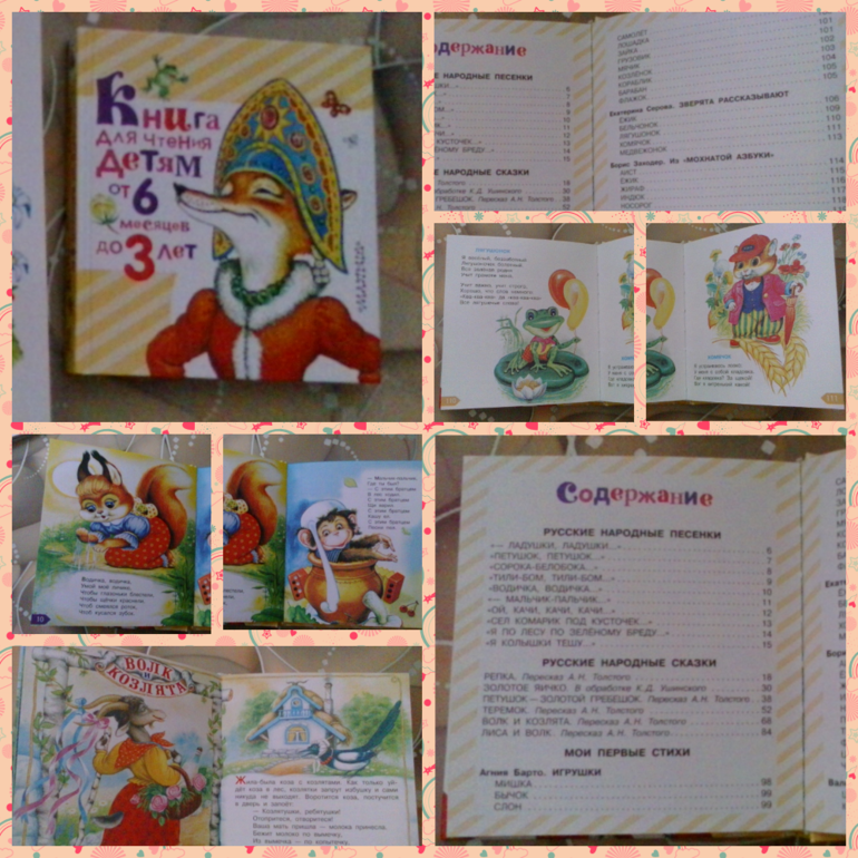 1. "Книга для чтения детям от 6 месяцев до трех лет". В нее входят стихи о животных и птицах разных детских авторов, русские народные сказки и песенки- потешки, стихи А.Барто, которые мы правда уже знаем )))) но из книги их не выкинешь уже. Книга очень красивая с понятными ребенку картинками и доступным текстом.