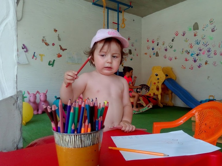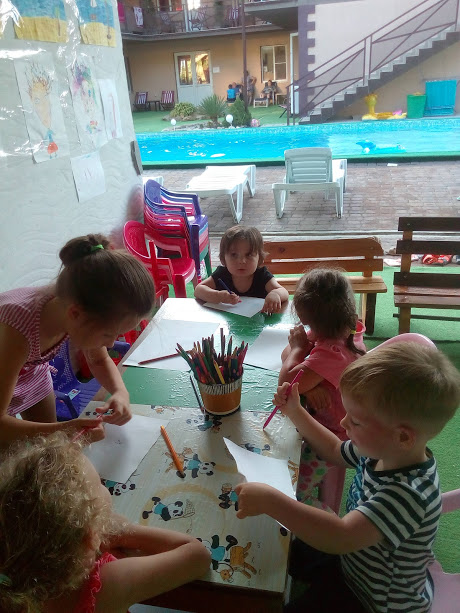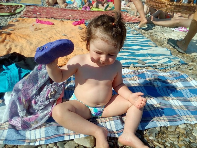 А ещё мы съездили на море. Туда ехали с подругой, через 2 дня она уехала и мы отдыхали вдвоём, и обратно вдвоём. Отлично отдохнули - и я и она. Не напрягала меня вообще, хотя мне все говорили, что отдых будет не отдыхом - с детками рисовала, играла, там анимация, детская зона, танцевали, соревнования какие-то - еле утащила её оттуда в последний день. Спала по режиму, одна - уложу, а сама к бассейну, или в бар вечером.)) Как сказала ей, что сегодня последний день, так она отказалась обедать и спать - сидела в игровой зоне не вытащить. Под конец отдыха осмелела совсем и шла на руки к взрослым, что для нас, конечно, нонсенс. В бассейне она купалась, море не понравилось - ей слишком много людей, шумно, на гальку вставать боится, волн боится. Ездили на море на 20 мин в день.)) Ещё я боялась ехать, т.к. сезон - кишечка там и т.д. Зря боялась. Всё не так страшно.