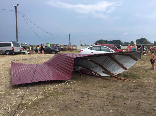 Но обо всем по порядку! В общем отдыхали мы, жара,солнышко,детки плескаются, и тут что-то затучилось и вроде как на дождь собирается, ну мы собрали вещи свои и перешли в беседку на берегу,думали обычный летний дождик,переждем) Собственно обычный летний дождик и начался, мы сидели в беседке,пили квас, дети на руках,и тут в один момент начинается нечто! Буря, смерчь, дождь с градом стеной,все сносит, градом бьет просто под углом таким что никакая беседка не спасает,мы решаем бежать в машину, это все в доли секунды...на столе лежат часы, айфоны, кошелёк ещё почему то...что хватаем мы с подругой? Одеяла и полотенца чтобы завернуть детей, пакет с сухой одеждой и воду! Это о цене и ценности))) Дальше бежим в машину, дети закутаны,насколько возможно, а нам по голове стучит град, бьют молнии прям рядом, и ничего не видно куда бежать, плюс вокруг летают куски крыш и прочее, я реально никогда так не боялась! Это просто животный инстинкт какой то укрыть свое чадо. Подбегаем к машине,она ещё не открылась сразу, в общем только когда я попала уже туда,увидела разорваное платье, поцарапаные локти,но это все неважно) все закончилось хорошо) даже коляски не унесло, на удивление)хотя сами беседки остались без крыш) А мы потом ещё все сушили и жарили шашлык,но ощущения я запомнила навсегда!)