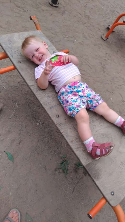 Стала такой активной! На улице вечно бегает, за мячом, за голубями, в догонялки, просто бегает) Но может и в песочнице залипнуть минут на 15)Прыгать пока не умеет, но усердно пытается.