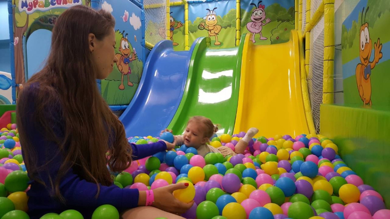 Вечером думали будем дома рассматривать и распаковывать остальные подарки, но потом решили, что коль праздник надо бы сходить в семейное кафе и не прогадали! Пришли в кафе, Аринку отвели в игровую комнату, она уползла в лабиринт и всё и не выходила оттуда около часа)) Родители ей были не нужны) За детками там присматривает няня, а родители могут спокойно насладиться вечером, это ведь и наш праздник тоже) Выманивала дочку из лабиринта хлебом) немного покормили на сколько она далась и опять убежала играть.