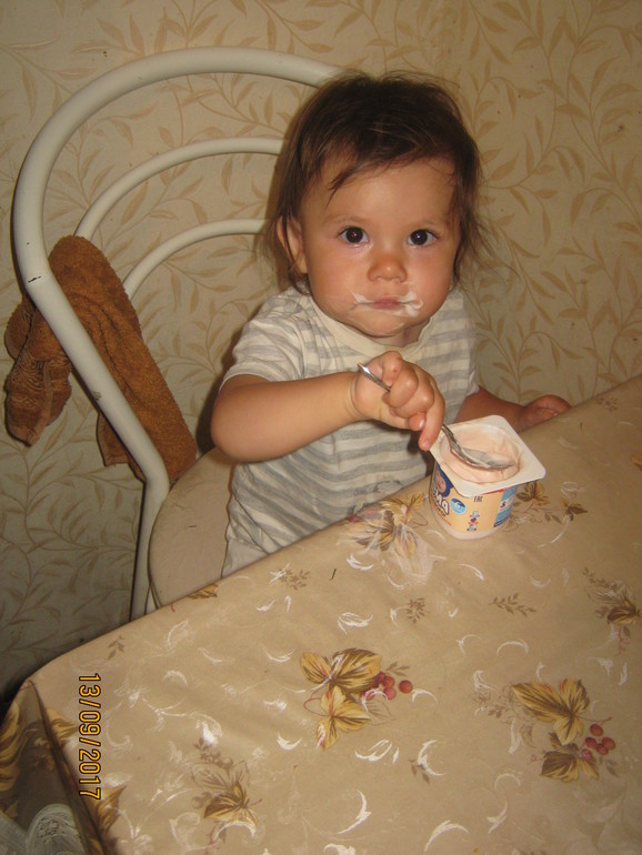 На днях убрала стульчик для кормления, теперь сидит, как взрослая. Кашу, творожок кушает сама, жидкое с двумя ложками, она - одной, я - другой. Если у нее нет в руке ложки, просто будет орать и не есть. Сисечница. Отказалась сама от пустышки, выбрасывает, а грудь еще чаще стала требовать, не поесть, а поторчать.