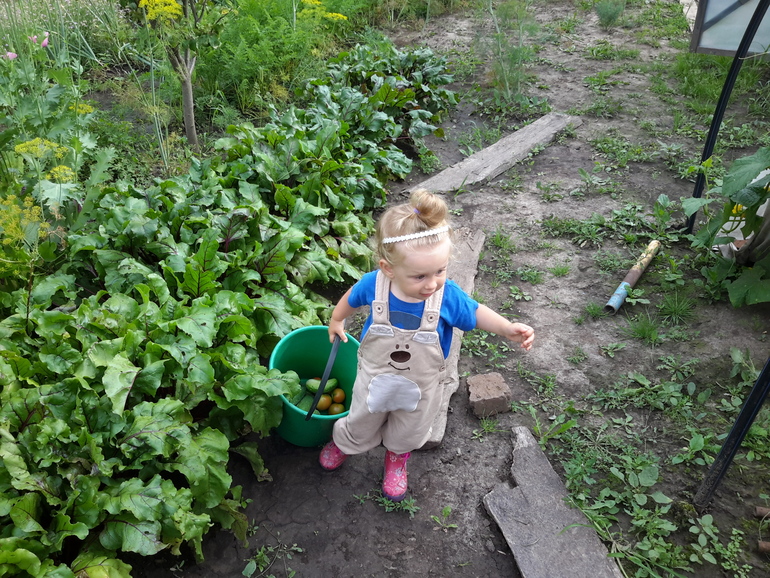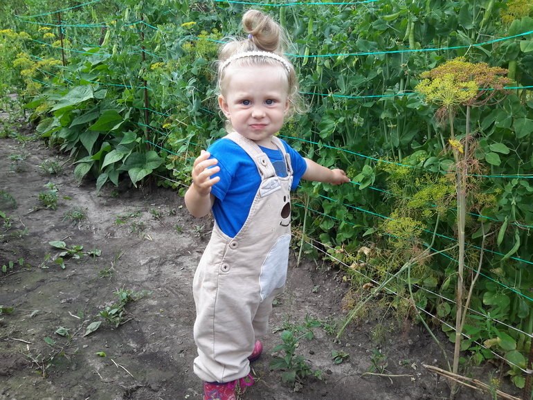 За лето Эмилия заметно вытянулась и окрепла. Бегает, меньше падает. Полюбила горки и сама на них забирается и скатывается, если не очень высокая. Висит на перекладинах, кольцах. Любит забираться на что-нибудь повыше. Любит общаться с дугими детьми, очень! В коляске сидеть не любит, поэтому, когда гуляем вдвоем, коляску стараюсь не брать. Когда идем, если начинает капризничать, ну или просто так, по моей просьбе показывает где небо, солнце, тучки, откуда идет дождик, где летают самолеты, где растут деревья, трава, где земля, где бегают кошки/собаки и т.д. Изучаем цвета. Цветы любит) рвет и нюхает. Летом очень любила катать машинки за веревочку. Очень привлекает самокат, к следующему лету будем покупать. На толокаре сидит, но не ездит сама. Коляску игрушечную приобрели ей, учится катать.Сейчас активно учится сходит со ступенек, бордюров, даже с табуретки не держась за опору.Кружится, ходит спиной вперед. Умеет надевать шапку, рукав куртки/ толстовки, пытается надевать штанишки, носки. Научилась обуваться в резиновые сапоги, причем, как правило, сапожки "дружат")