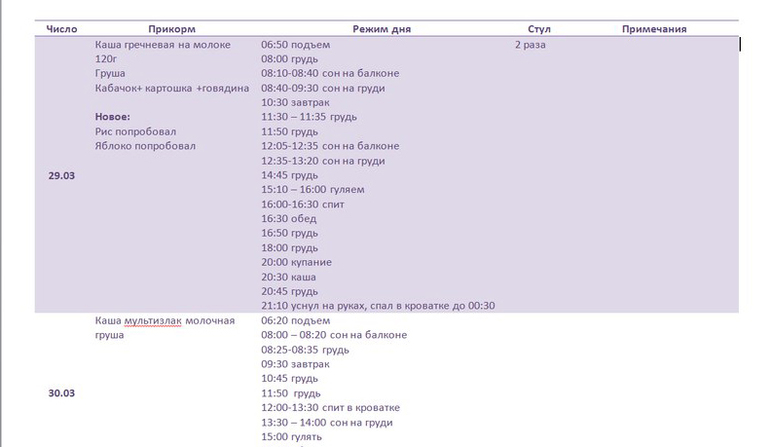 Режим появился, как начали вводить прикорм, а точнее уже стали не только пробовать, но и съедать приличные порции. Но так как малыш ел грудь и спал как попало, часто я упускала время когда нужно было кормить. Я сразу решила отладить режимы и сна, и кормления. Первое время просто наблюдала за малышом и вела табличку. Когда он спит и сколько, когда хочет есть, когда просит грудь. Спустя неделю, я четко знала, сколько времени он примерно бодрствует, и через какое время хочет кушать. Сколько длятся дневные сны и тп. Определилась ориентировочно с часами дневных снов и завтраков, обедов ужинов. С грудью тоже начала выдерживать четкие интервалы. Если сильно просил давала, конечно, но уже не сразу, а сначала старалась чем-то отвлечь. Иногда получалось, иногда нет.