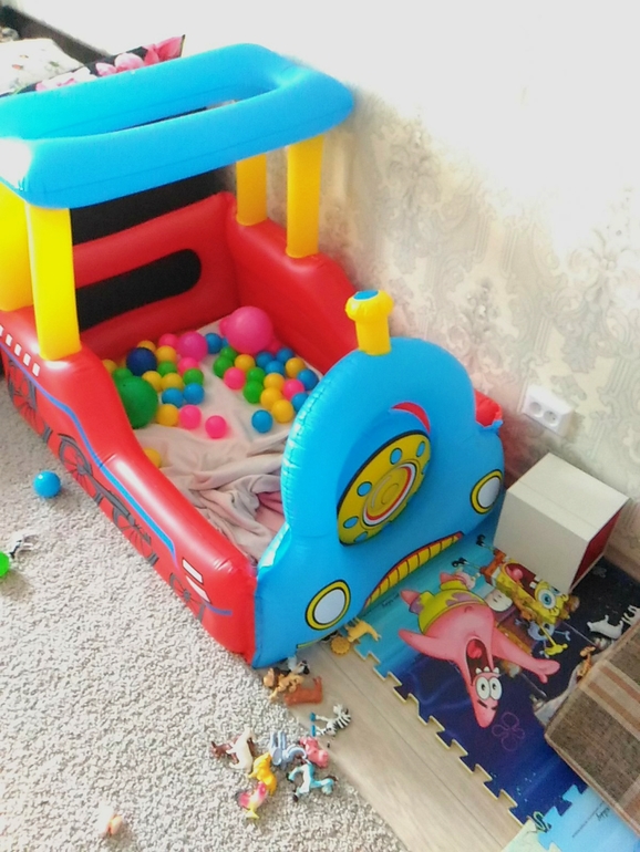 нам вот такой надувной паровозик подарили. Счастью небыло предела. У нас двойня. Дети не вылазят из него. Нам год и месяц.