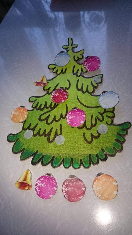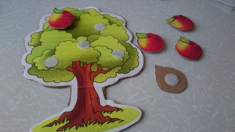 яблоню и елочку сами сделали,приклеила картинку на картон и налепили липучек)