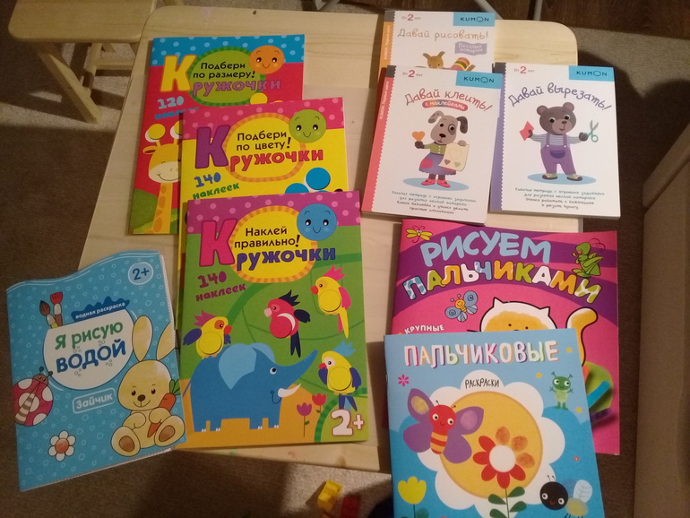 Закупились всякими тетрадками- развивашками. Вот где наклеивать кружки по цветам, размерам- его любимая, покупаю уже раз 3. С пальчиковыми красками тоже очень активно используем. Вот кумон пока отложила, думаю ближе к 2 годам дам. На фото только малая часть наших тетрадок 🙈
