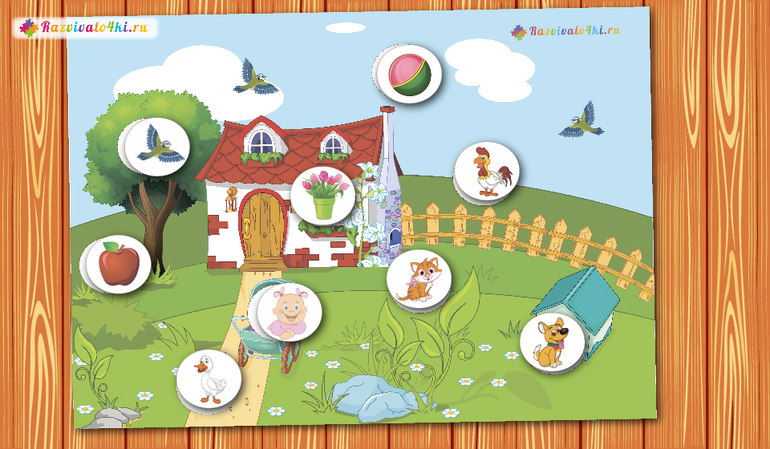 Положите перед ребенком сюжетную картинку с «непрорисованными» объектами и фишки с объектами. Малыш должен разложить по картинке эти кружочке на определённое место. Иначе говоря, он должен дорисовать картину готовыми фрагментами.