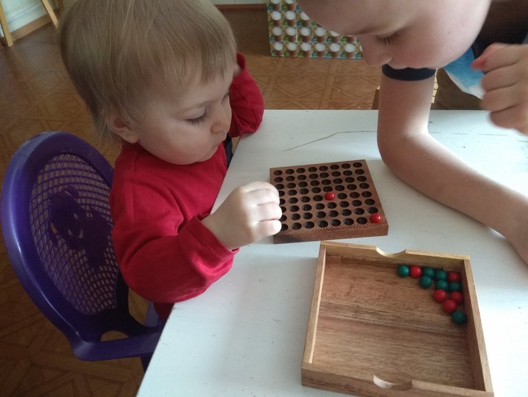 И последняя игра на сегодня - разложить шарики по лункам. Потом можно использовать чередование, счёт, высокий-низкий и т.п. Хорошая игрушка.