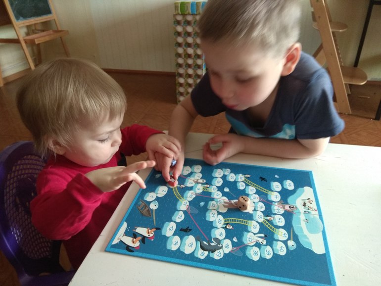 Тут игра-ходилка самая простейшая. Лёня часто видит, как мы играем и уже умеет бросать кубик и имитировать ходы фишками под счёт "Раз, два, три..."