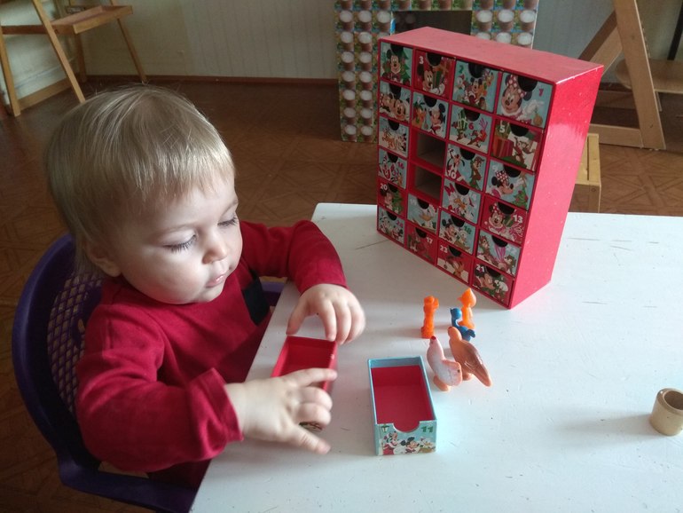 Этот ящичек - адвент-календарь, покупавшийся для старших детей. А теперь в нём хранится всякая мелочь из киндер-сюрпризов и пр.