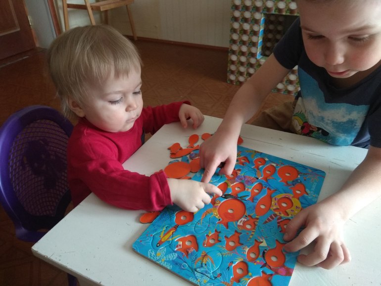 Пазл от Djeco - очень интересно сделанный. Когда мы его только достали, то учились вынимать рыбок, тыкая пальчиком с обратной стороны. Сейчас вставляем самую большую рыбку, самую длинную и жёлтую.
