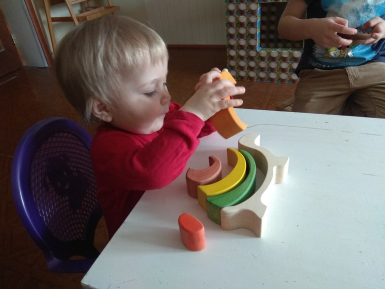 Улитка (хотя мой средний сын уверяет, что это черепаха) от Сказок дерева. Тут я даю свободу творчества - он ее разбирает, потом собирает что-то свое, потом собираем обратно и улитка медленно уползает от Лёни обратно в коробку.