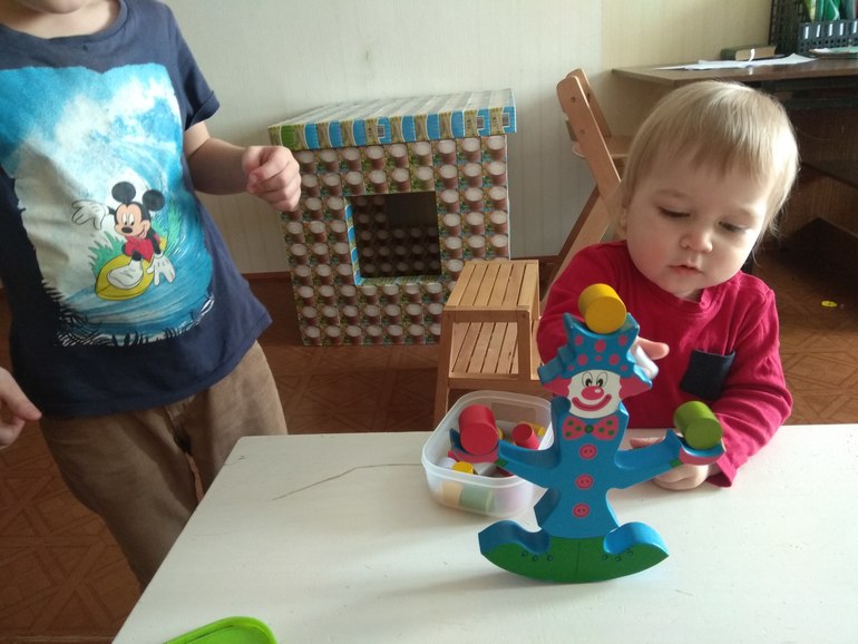 Тут клоун, которому на ручки надо складывать цилиндры разного диаметра и и не допустить падения. Первый раз показывала его Лёне - потому наверное, и не очень он впечатлился. Не понял пока.