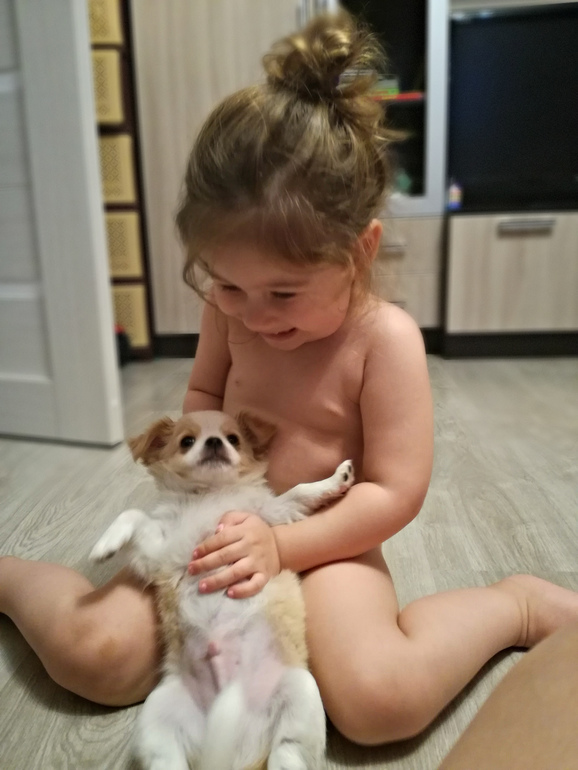 На новый год бабушка подарила нам щенка) я конечно же знала о подарке, это было обдуманное решение. Так что растут у нас теперь два малыша, играют вместе, собака иногда сбегает от нее и бывает повизгивает, но возвращается снова к Еве)) Выпускаю щенка из вольера и Ева ему: - пошли, собак!