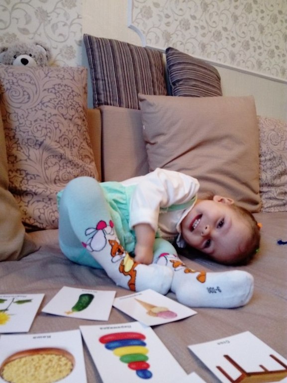 Дома рисуем восковыми карандашами. Пока рисование у нас нечастое, вижу, что оно не особо привлекает ее. Но вот карточкииии..это любовь. Недавно случай был. Я завтрак готовила, а Викуся притихла. Захожу в комнату, а там... по всему периметру дивана очень аккуратно (!) одна к другой разложены все 70 наших карточек. И она стоит сама с ними "занимается", повторяет пройденное :)