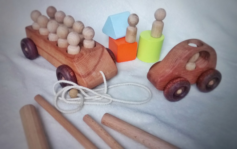 2. Маленькая машинка подойдет как первая игрушка-каталка, за счет окошек и отверстий ребенку удобно держать. Сначала детки катают ручками, а потом за веревочку, и здесь придет на помощь "старший" друг (вторая машина с пассажирами)