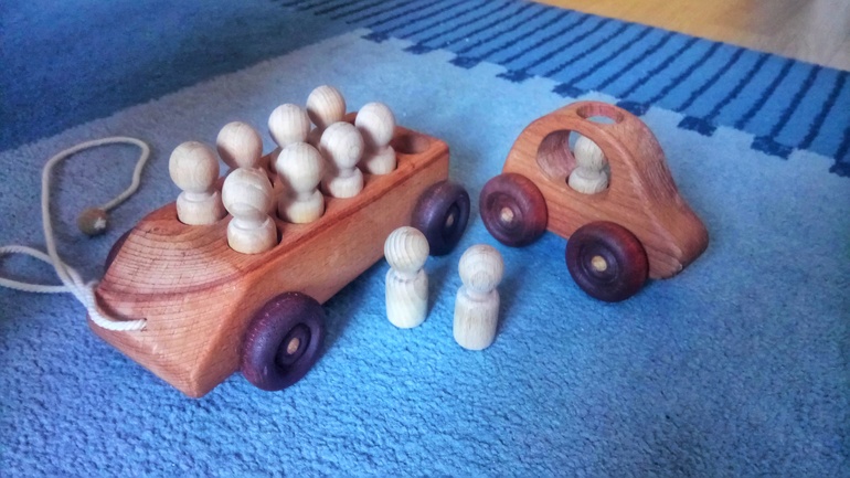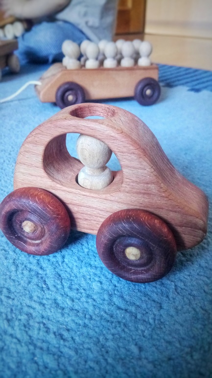 1. Машины прекрасно отшлифованы, никаких заноз, заусенцев и т.п. Выполнены из бука, а пассажиры из липы, игрушки покрыты льняным маслом, что позволяет дереву дышать и не ссыхаться. Благодаря тому, что игрушки не покрыты лаком, сохранилась шершавость дерева, что сказывается на тактильном развитии ребенка (как мне кажется ). И конечно игрушки безопасны, если ребенок решит попробовать на зубок или у кого-то еще на язычок)) Наш всех человечков "облюбовал"-облизал-пожевал))