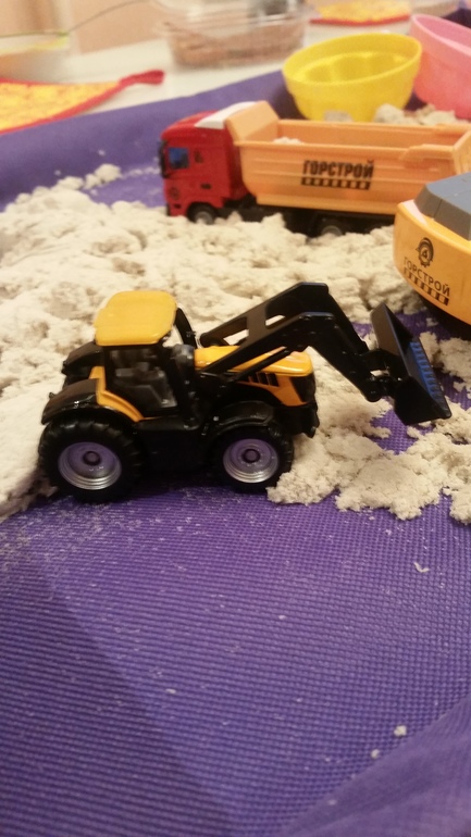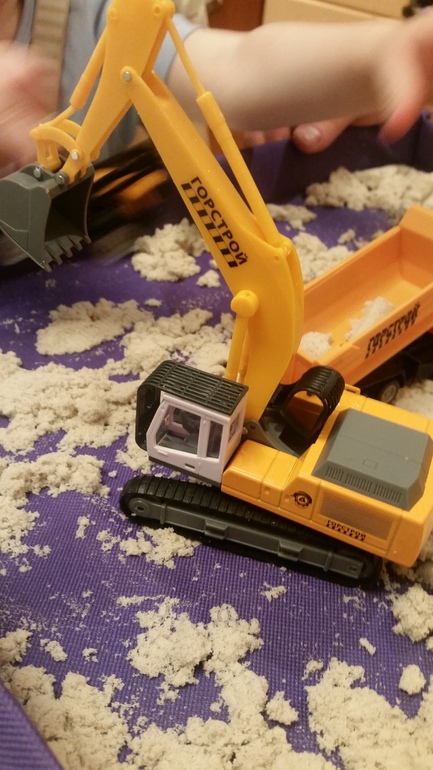 Мы чаще всего играем в стройку (грузим и возим песок, роем котлован, строим лего-дом), иногда в пляж (ставим лего-лежаки и зонтик, ларек с мороженым и тд), в парк (сажаем лего-деревья, ставим горку и качели из лего), в уборку снега, строим замок и дорогу к нему... Ну и просто формочками играем, прячем что-нибудь в песок и потом откапываем, смотрим, какие следы разные машинки оставляют.