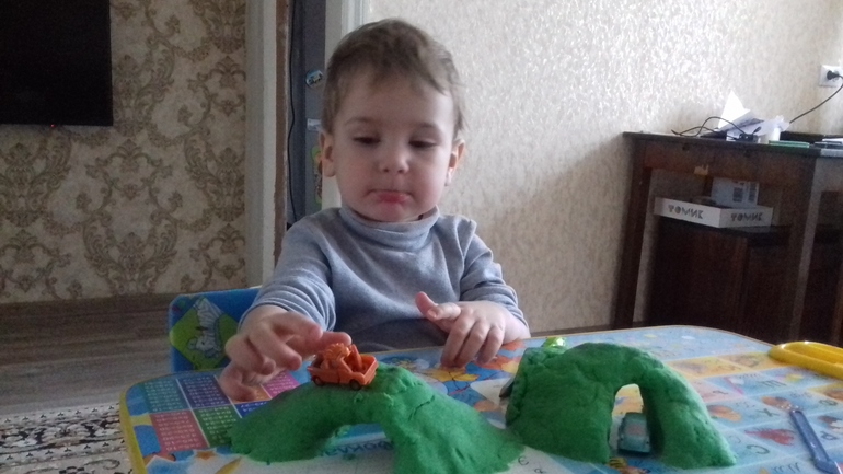 Сейчас с динозаврами часто играет, целые локации для них отстраивает, добавляем ракушки,камни, минералы, растительность, водоемы и пр... еще не писала пост на эту тему, из последнего - изумрудный город строит из изумрудного песка https://www.babyblog.ru/user/id1150049/678729