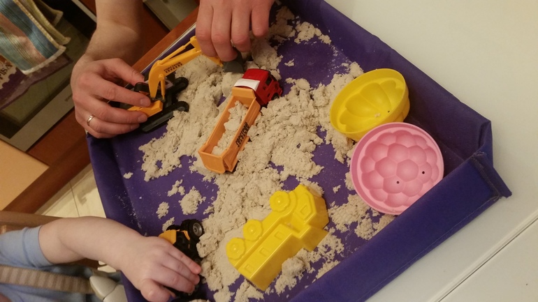 Переложить в коробку с небольшими бортиками, для удобства. А что делать....лепить куличики, делать постройки, прятать камушки или что-то еще и устраивать раскопки, выкладывать разноцветные дорожки на нем, устроить вереницу следов - машин/зверей, делать горку, варить суп, загружать песок в кузов и развозить, рисовать. Изучать понятия разные большой/маленький, геометрические фигуры, использовать счетные палочки - к примеру делать забор и т.п.