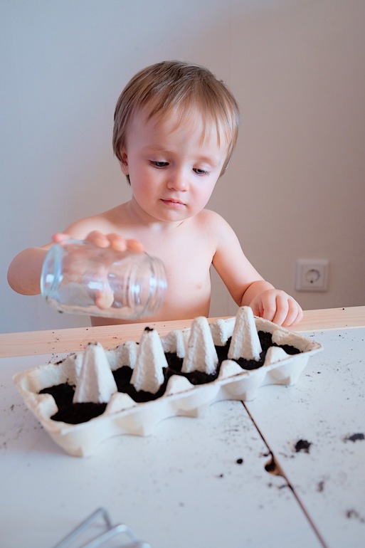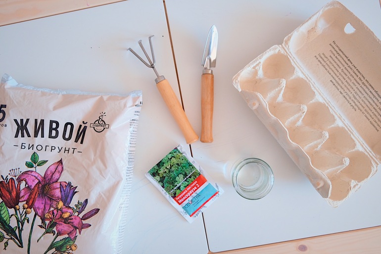 1. В упаковку из под яиц лопаточкой насыпаем землю. Оставляем немного для того, чтобы потом присыпать семена.