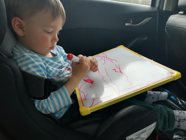 Мы вот так ездим. В качестве столика небольшая маркерная доска - это не очень удобно, так как приходится её придерживать, но лучше чем ничего))